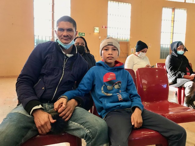 Micaheel, who was hit by a stray bullet while on his way to the shop, with his father, Igshaan Pedro, came to share their story at a public meeting on rising crime in Hillview. Photo: Tariro Washinyira
