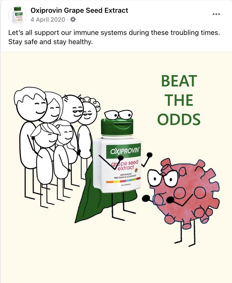 An advert on Oxiprovin’s Facebook page states, “Let’s all support our immune systems during these troubling times. Stay safe and stay healthy.”