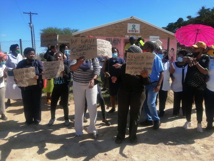 Community health workers protest outside Lukhanyo Clinic in Addo last month for permanent jobs. The provincial department of health says it does not have funds to renew their contracts. Archive photo: Mkhuseli Sizani