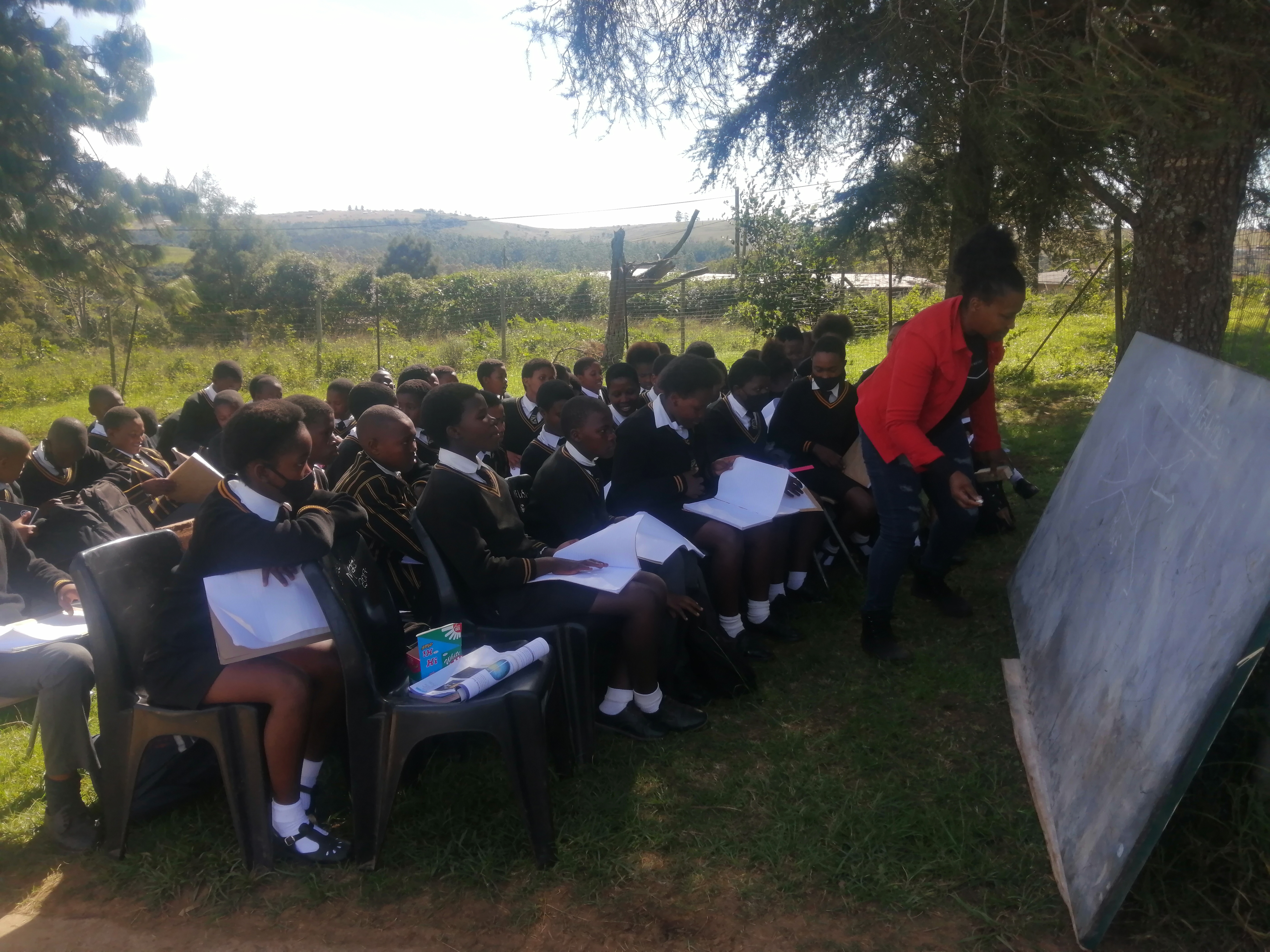 Amanda Gangca teaches learners under a tree due to a shortage of classrooms at Holomisa Senior Secondary School in Mqanduli.
