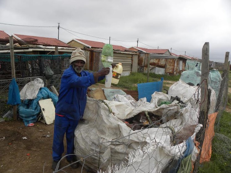 Ntsokolo Konzapi, who is 72, survives by supplementing his pension by collecting and selling discarded plastic containers to recyclers in Port Elizabeth.