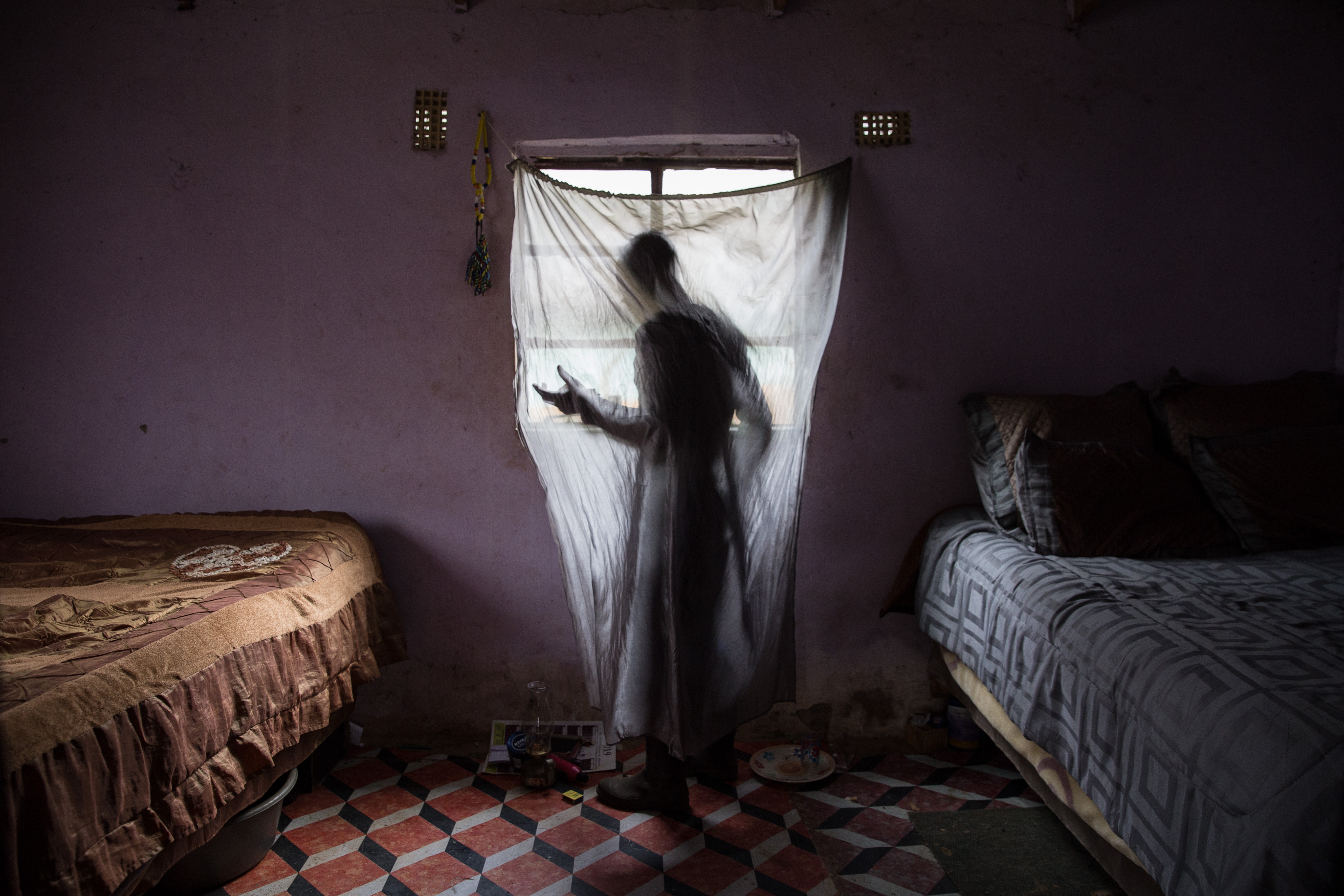 A resident of Mkumbi stands by the window of his home searching for a weak cell phone signal.
