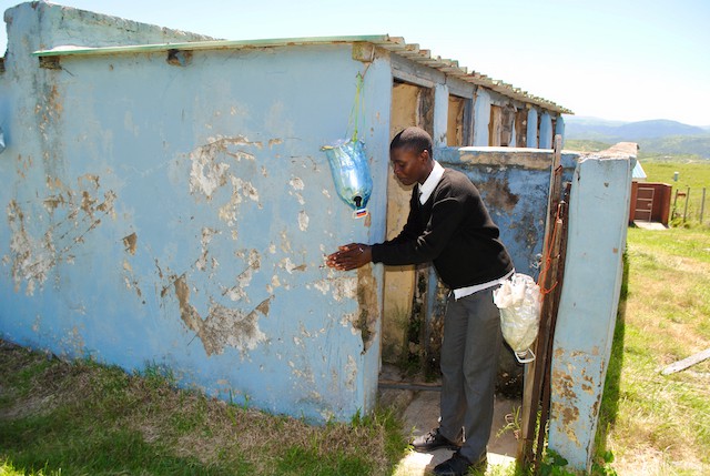 Learners at Mtakatye Junior Secondary School wash their hands with water from used wine box bags. Photo: Mkhuseli Sizani