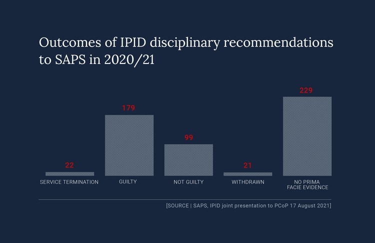 A recent joint SAPS and IPID presentation to Parliament’s Portfolio Committee on Policing revealed that the police had refused to take disciplinary steps in 229 of the 550 IPID cases “finalised” in 2020/21. This is the highest such figure on record. In all these 229 cases, IPID investigators concluded that police officers had a case to answer. They were overruled by SAPS management.