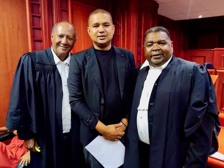 On Friday, Wesley Neumann’s legal team asked the Labour Court to enforce an earlier ruling for his reinstatement as Heathfield High principal. From left: Advocate Vernon Seymour, Wesley Neumann and advocate Rod Solomons. Photo: Marecia Damons.