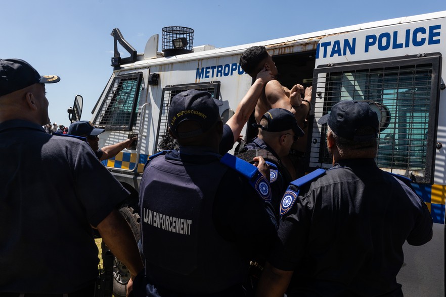 When GroundUp arrived, there was a standoff between protesters and police in riot gear. There was a heavy police presence, with City law enforcement and SAPS officers present before either protest started. Four people were arrested.