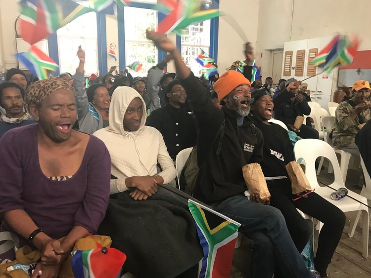In Cape Town about 80 people living on the streets watched the game together at a soup kitchen run by Ladles of Love at the Hope Exchange. They gathered in a hall where they were served popcorn, cold drinks and pizza donated by Pizza Hut. The hall had three large TV screens and was decorated with South African flags.