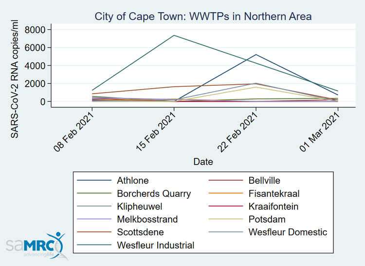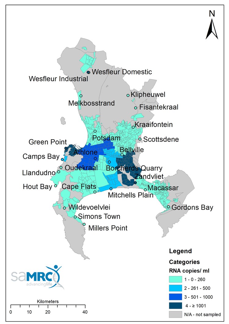 The June 2020 study reported Covid-19 viral RNA levels from four treatment stations at Athlone, Macassar, Zandvliet and Cape Flats (together serving roughly half of the city’s inhabitants), as well as the station of the municipality of Stellenbosch. Levels at these stations were lowest in Stellenbosch and highest at Zandvliet, corresponding to the number of Covid positive cases in their respective catchment areas at that time.
