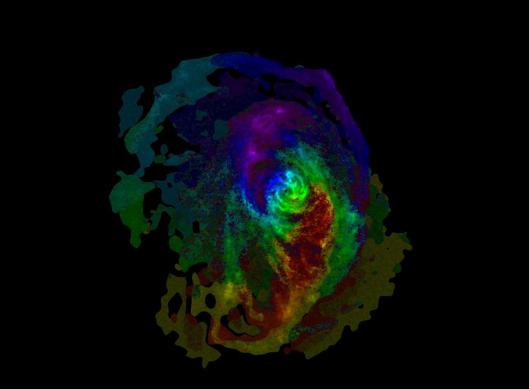 This image shows the M83 galaxy, colour coded according to the velocity of the gas in each location. From this we can see that not all of the galaxy is moving at the same speed. Astronomers can use this information to calculate the mass of this galaxy. There are basically only seven colours in this image, whereas if we had finer channels we would be able to see finer details on how the gas is moving and interacting with the rest of the galaxy. Image: Sean Passmoor/SARAO