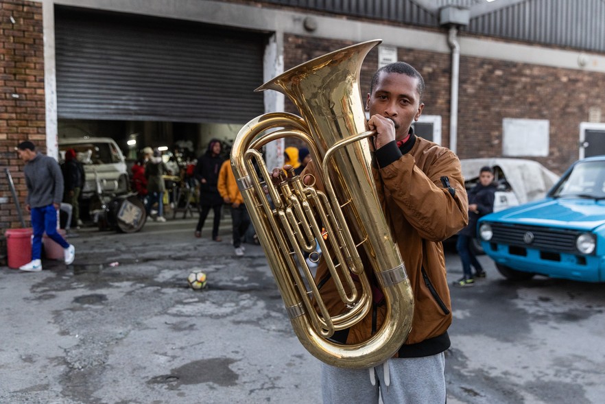 On Sunday afternoons, loud brass instruments can be heard from a panel beating shop in Athlone. Surrounded by dusty cars, paint tins and tools, it is here that the Silver Sounds Band has been practising their roaring goema music for over 15 years. This is the same music that is played by the minstrels or “Kaapse Klopse” every year.