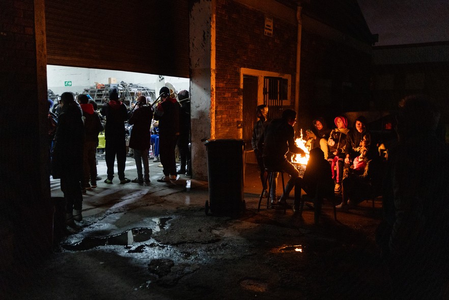 The musicians are split into different areas across two warehouses. They do this as the brass instruments are loud. After practice they join up and play together.