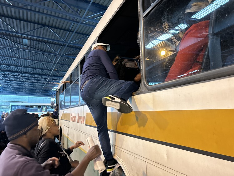 Desperate commuters climb through a bus window at Cape Town’s Golden Arrow bus terminus. Video: Matthew Hirsch