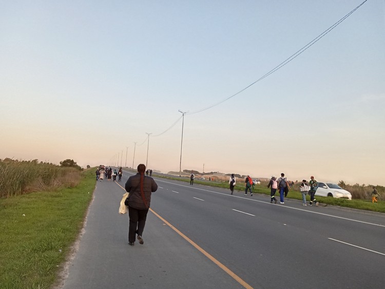 Commuters were asked to disembark from buses, e-hailing taxis and other transport on Jakes Gerwel Drive towards Mitchells Plain. Some people said they had walked all the way from town. Photo: Qaqamba Falithenjwa