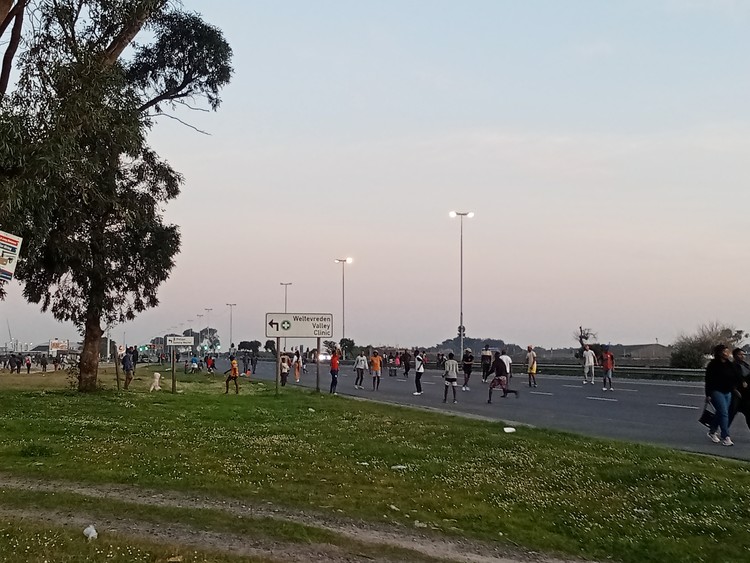 Many people on Jakes Gerwel Drive opposite the entrance to Samora Machel. Photo: Qaqamba Falithenjwa