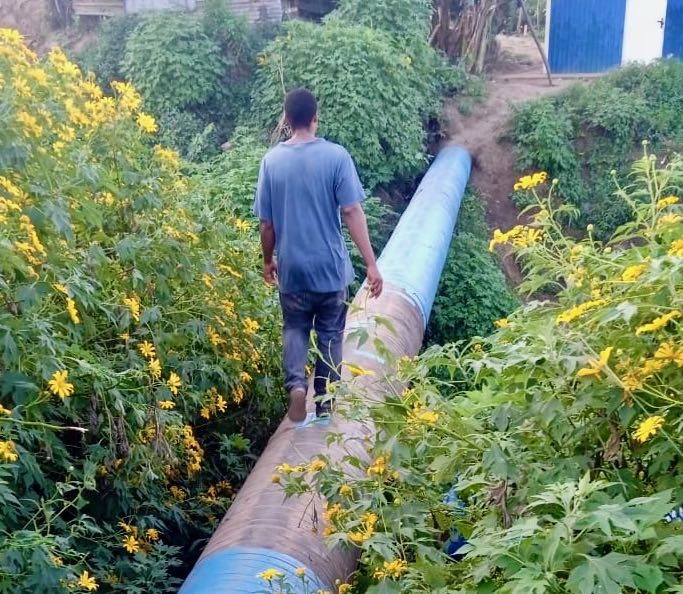 The pipeline was exposed by the 2022 floods and now serves as a bridge. Crossing the round and often slippery pipeline while carrying water buckets is dangerous.