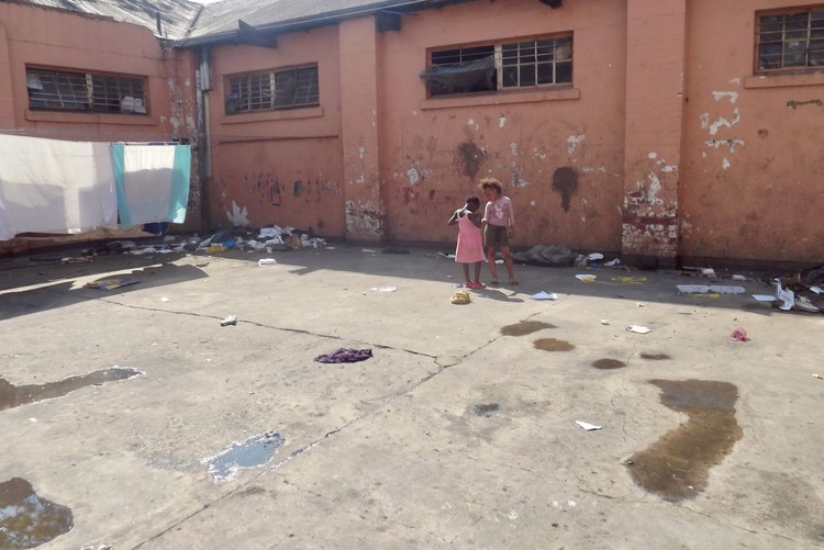 Children play in a filthy area at Struben No 2 Shelter.