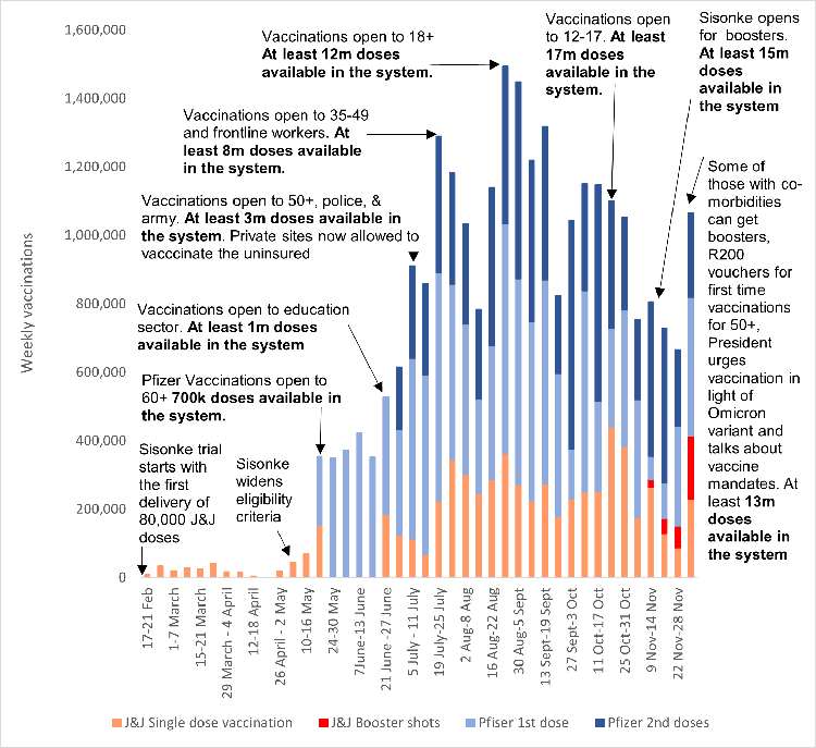 Only 38% of adult South Africans have been fully vaccinated and another 7% partially (as of 5 December). The rollout has been driven by demand from the âvaccine keenâ, as GroundUp editor Nathan Geffen and Spotlight editor Marcus Low called them. The pattern of weekly vaccinations revealed a recurring pattern: the vaccination picks up whenever access is widened, allowing more of the âvaccine keenâ to get vaccinations, then slows down rapidly, once most of the eligible âvaccine keenâ have been vaccinated. At no point, however, has the vaccination rate been fast enough to use up the steadily accumulating supply of doses in the system (see graph).