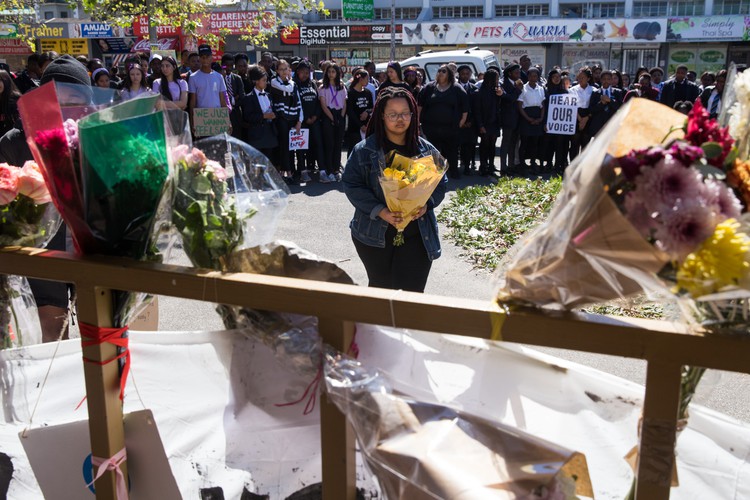 The learners then made their way to the post office where a makeshift memorial filled with flowers and messages has been put up. In the photo above, 17-year-old Tamzyn Freeks of St Joseph’s Marist College is laying down flowers at the memorial site.