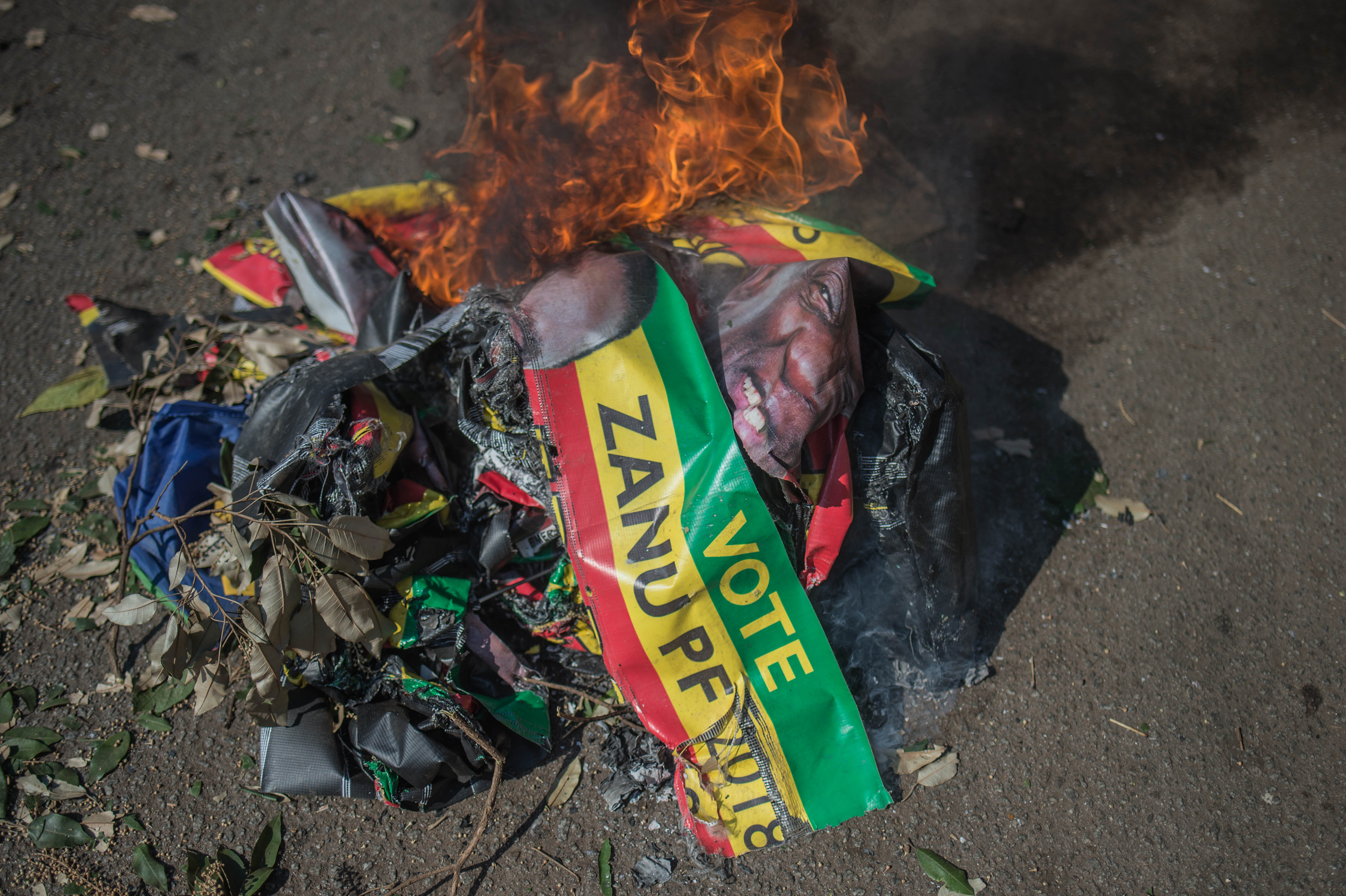 Protesters in Harare burnt ZANU PF posters. Photo: Mujahid Safodien.