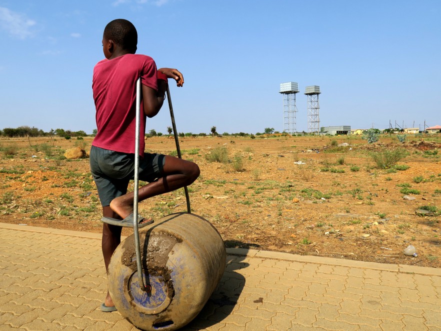 A boy with a drum of water collected from a private farm borehole waits for his friend before continuing home. Behind him are empty water reservoirs meant to supply the state-built homes in Mazista. Photo: Steve Kretzmann