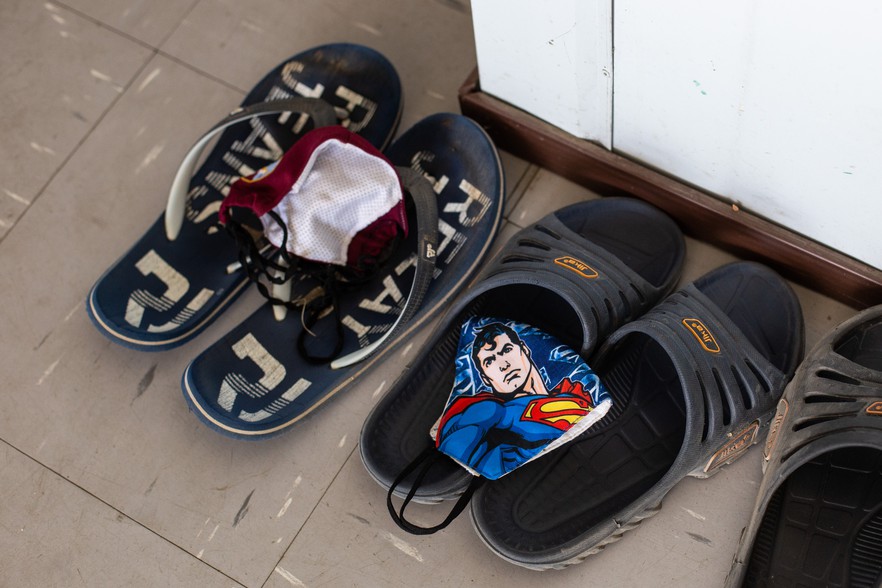 Children leave their shoes and masks before changing into their uniforms. They all have white masks to wear.
