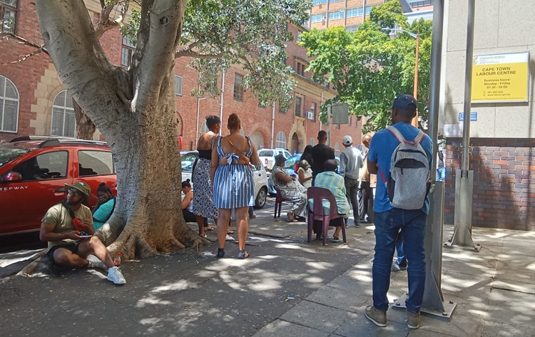 Queues of people trying to claim UIF and get help for other issues are almost a permanent feature outside the labour department offices in Cape Town. Photo: Qaqamba Falithenjwa