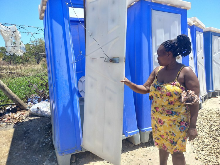Akhona Zazini said many of the doors of the portable toilets are damaged, leaving residents with no privacy. Photo: Marecia Damons