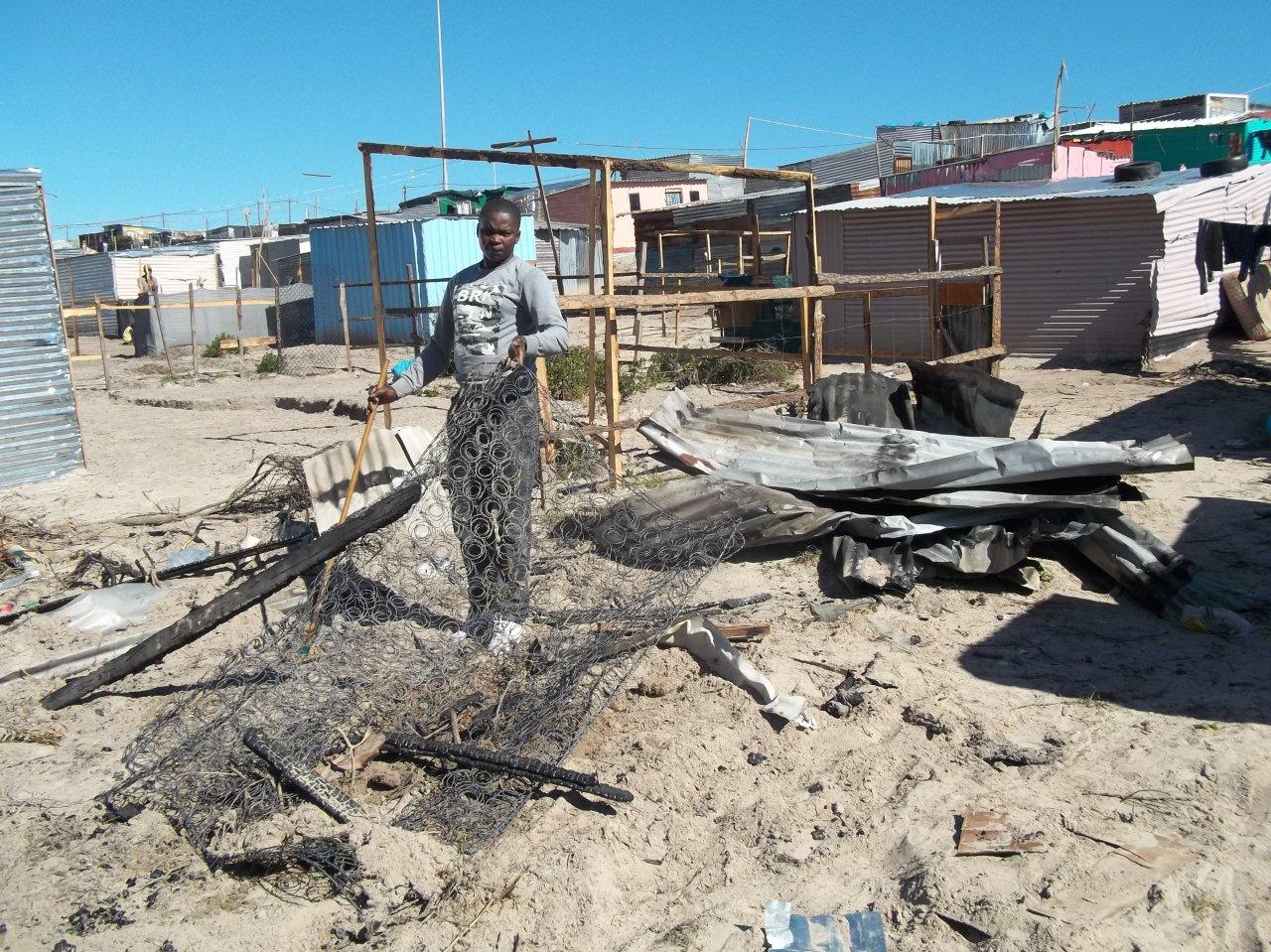 On Monday residents tried but failed to extinguish a fire that burned down a shack at about 5am, said Msimelelo Vuba, 31. Vuba said he was waiting for transport to work in Athlone when he saw flames engulfing his neighbour’s shack. “I hurried to the shack and found residents battling the fire. The residents dug up sand and scooped it with spades, throwing it into the burning shack.”