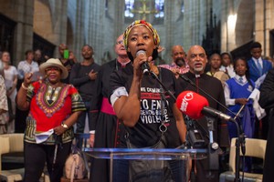 Vuyiseka Dubula of Sonke Gender Justice addresses the audience during the Ahmed Kathrada memorial at St. Georges Cathedral in Cape Town.