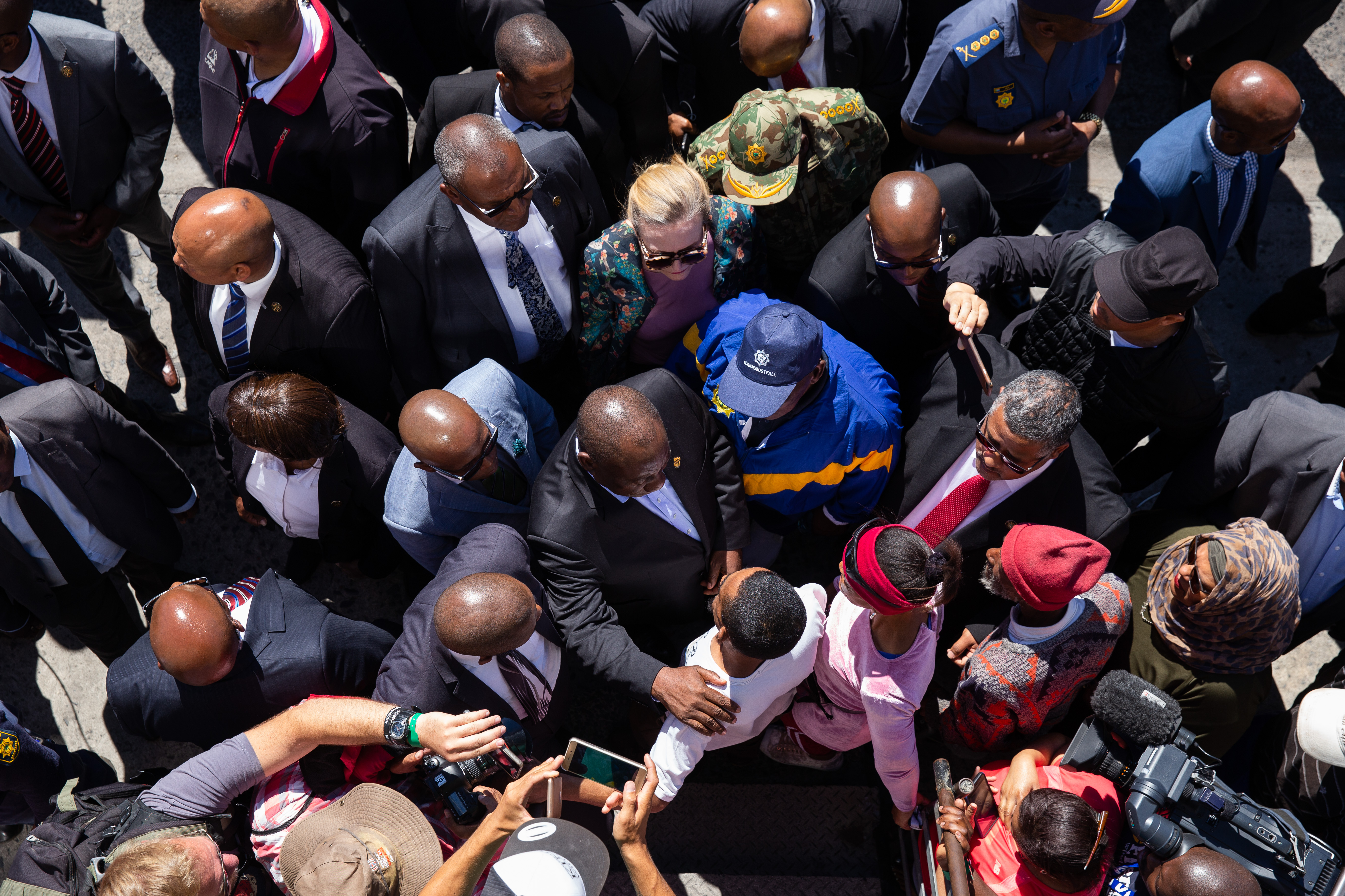 South African president Cyril Ramaphosa speaks to residents in Hanover Park during a walk around for the launch of the Anti-Gang Unit. The aim of the unit is to fight organised crime and drug distribution in the cape flats.