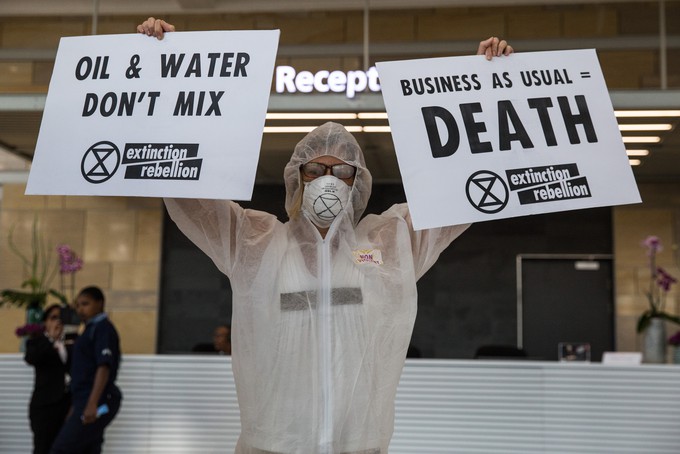 Climate change activists dump fake “blood” and “oil” in the lobby of the Cape Town International’s Convention Centre (CTICC) in South Africa, during the the Africa Oil Week conference.