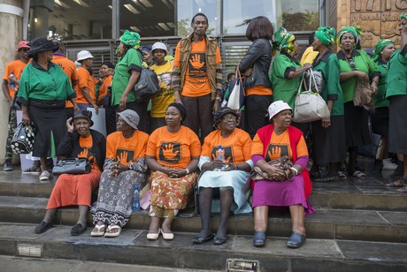 People affiliated with the Black Sash movement can be seen holding a protest outside the Constitutional Court in Johannesburg as the case involving the social grants proceeded inside. In green are women from the ANCWL who come to show support for the Minister Dlamini.