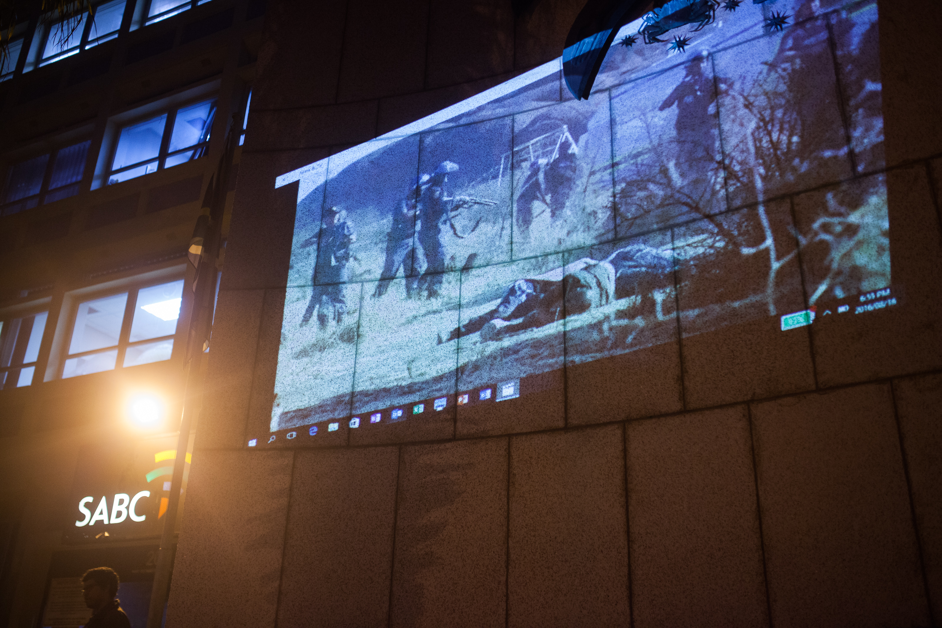 Protests screen documentary film β€˜Miners Shot Down’ outside the SABC offices in Sea Point, Cape Town. Protesters were demanding that SABC screen the film on television.