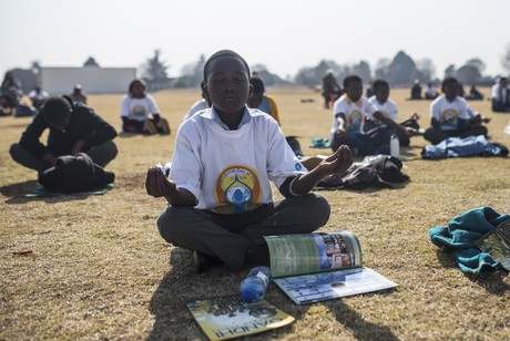 Young and old celebrate International Yoga Day at the Lenasia Cricket Stadium in Johannesburg