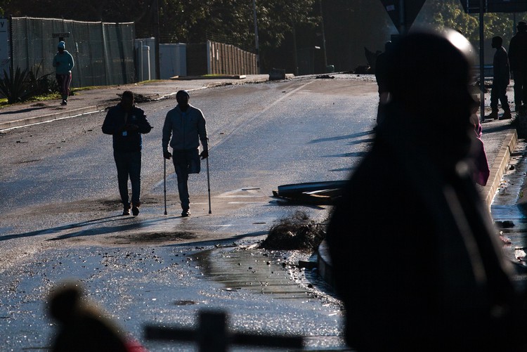A man on crutches walks towards a protest at Imizamo Yethu in Hout Bay.