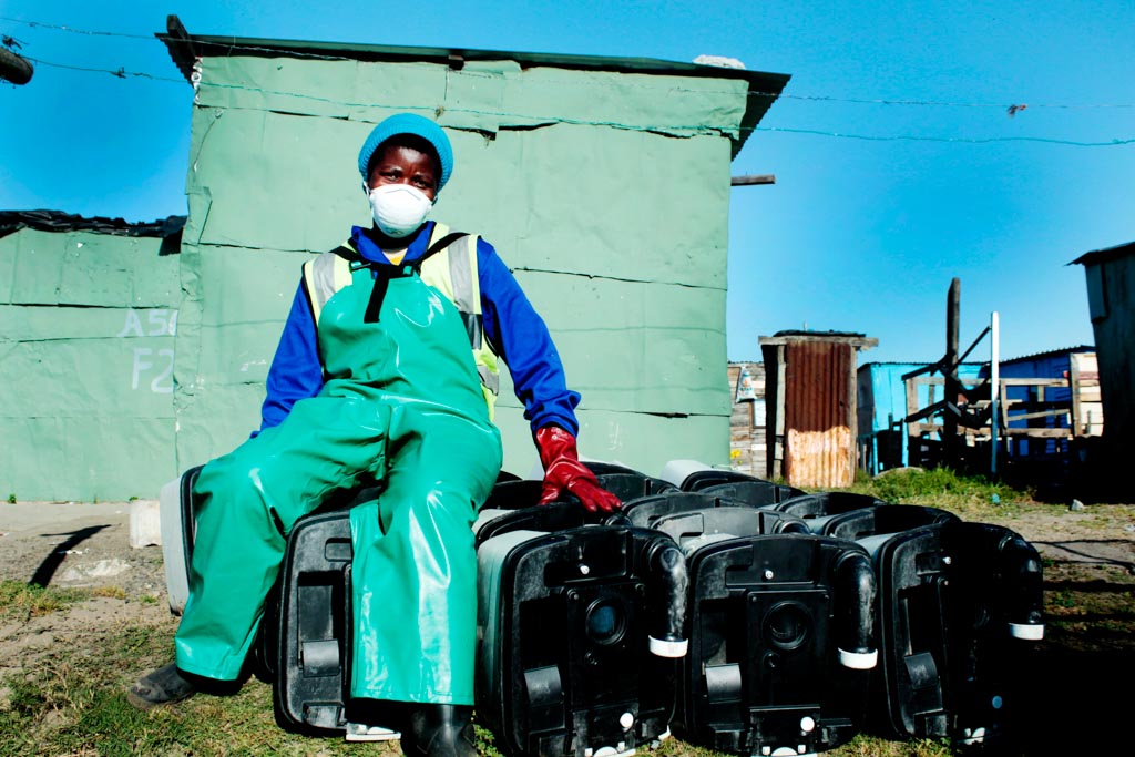 Patricia Peters returns toilets to shacks in Freedom Farm.