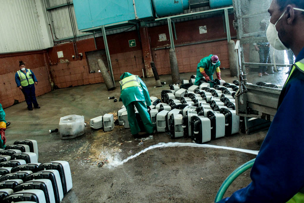 The smell at the collection point in Freedom Farm is unpleasant, but for first-timers, like the GroundUp reporters, the smell at the cleaning facility in Borcherds Quarry is unbearable. It is not just the smell of excrement that is awful; so too is the stench of the cleaning chemicals.